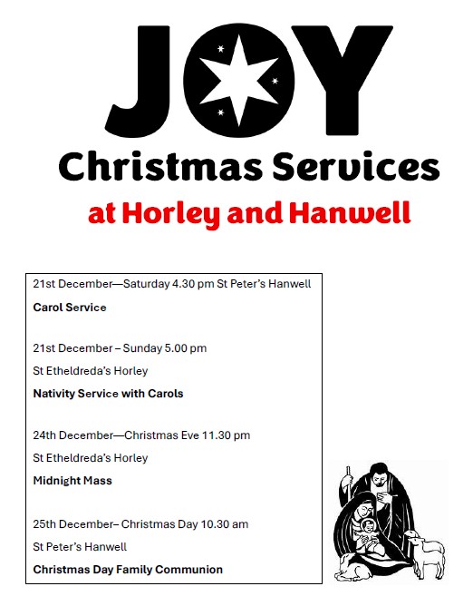 There will be Christmas services in Horley on Sunday 21st December (Nativity and Carols) and on Christmas Eve (Midnight Mass). See below for details of all services in Horley and Hanwell this Christmas.