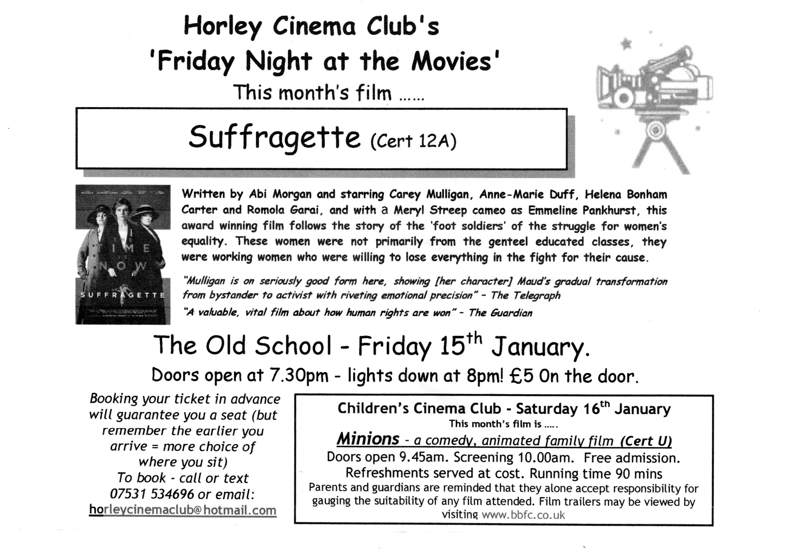 Cinema Club- Friday 15th & Saturday 16th Happy New Year from Horley Cinema Club. Our first movie for 2016 is Suffragette on Friday 15th at 7:30, see the flyer below. Also note Minions for the the children’s club showing on the Saturday 16th at 9:45. To share : Click to email a link to a friend (Opens in new window) Email Click to share on X (Opens in new window) X Click to share on Facebook (Opens in new window) Facebook Like Loading... Related