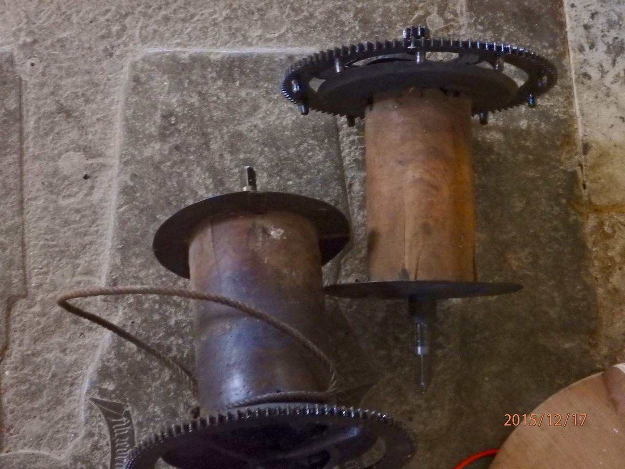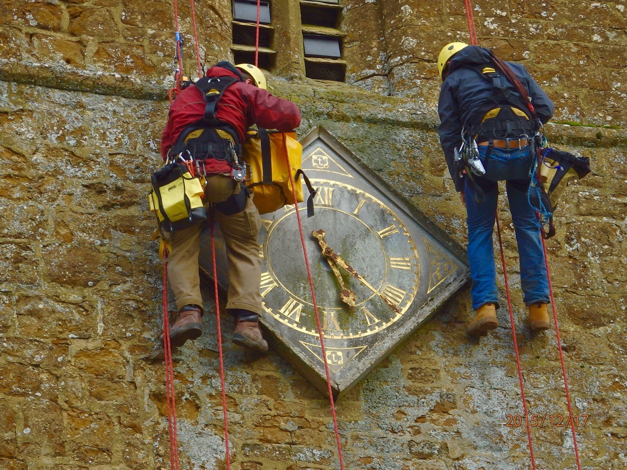 The old mechanism was dismantled and lowered to the ground in manageable pieces, and the clock faces were dealt with by two abseilers suspended from the top of the tower, and lowering the pieces to the ground. When the clock face was removed the original face was behind it and can still be seen in place until the new face is refitted, it appears to be made of stone or slate but intriguingly doesn’t bear the mysterious J’s or t’s that appear on the dial being refurbished.