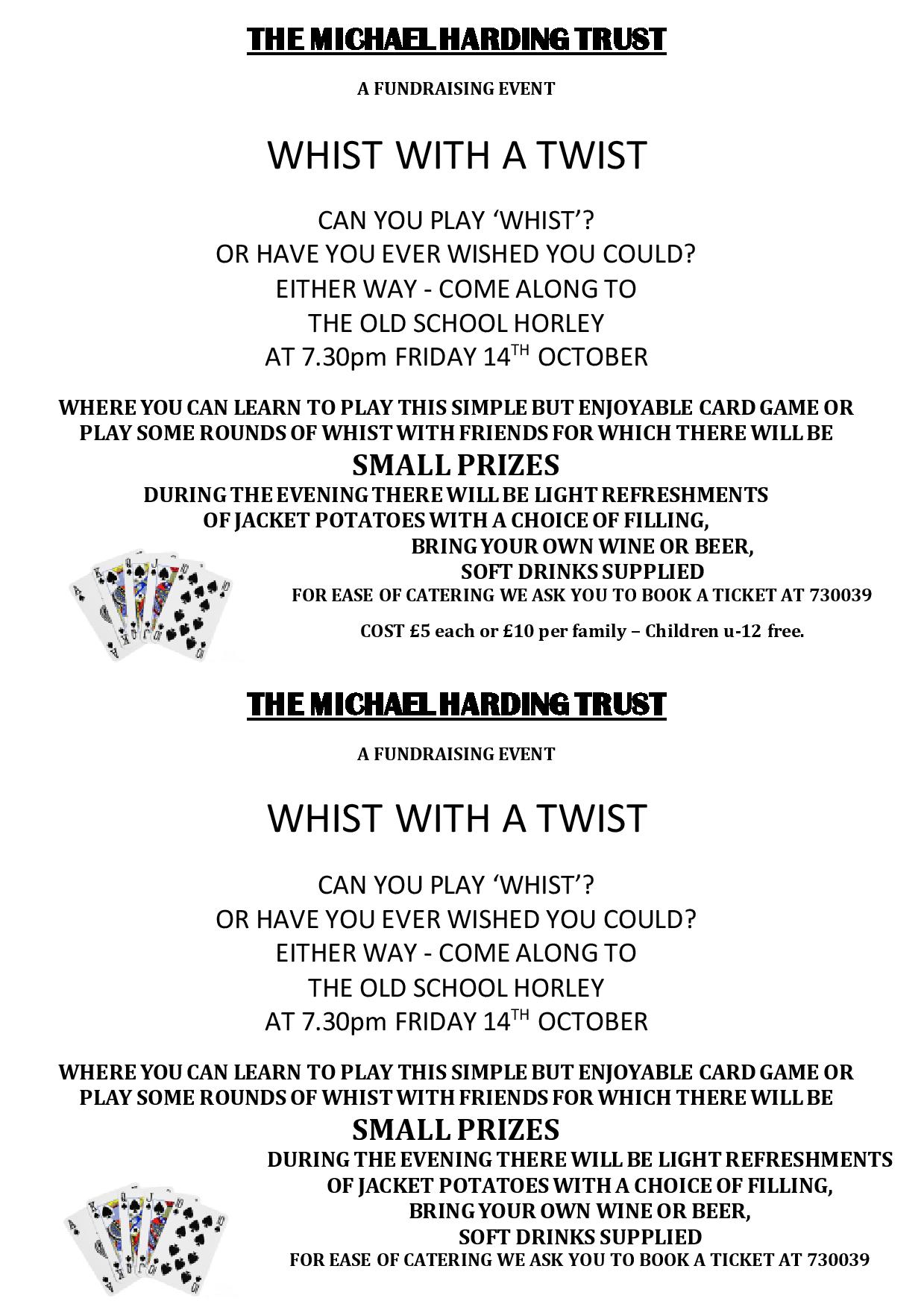 Whist With A Twist… Enjoy a game of cards? If so come and play a hand of Whist next Friday. To share : Click to email a link to a friend (Opens in new window) Email Click to share on X (Opens in new window) X Click to share on Facebook (Opens in new window) Facebook Like Loading... Related