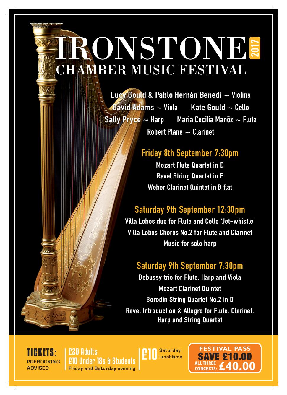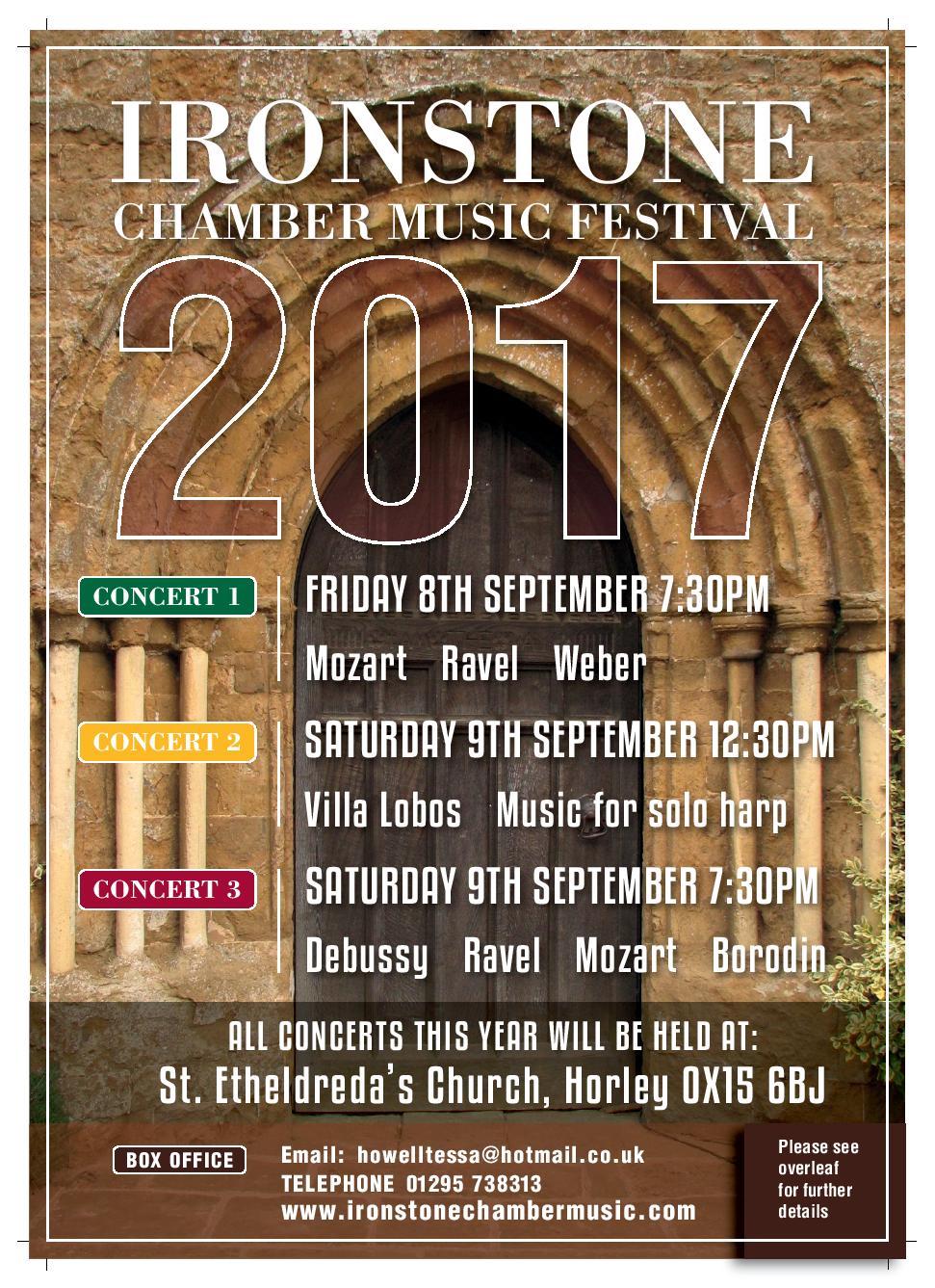 Friday September 8th at 7.30 pm, Saturday lunchtime concert at 12.30 pm and evening at 7.30pm. Tickets available via Tessa on 01295 738313 or howelltessa@hotmail.co.uk. Also see our website for more details www.ironstonechambermusic.com