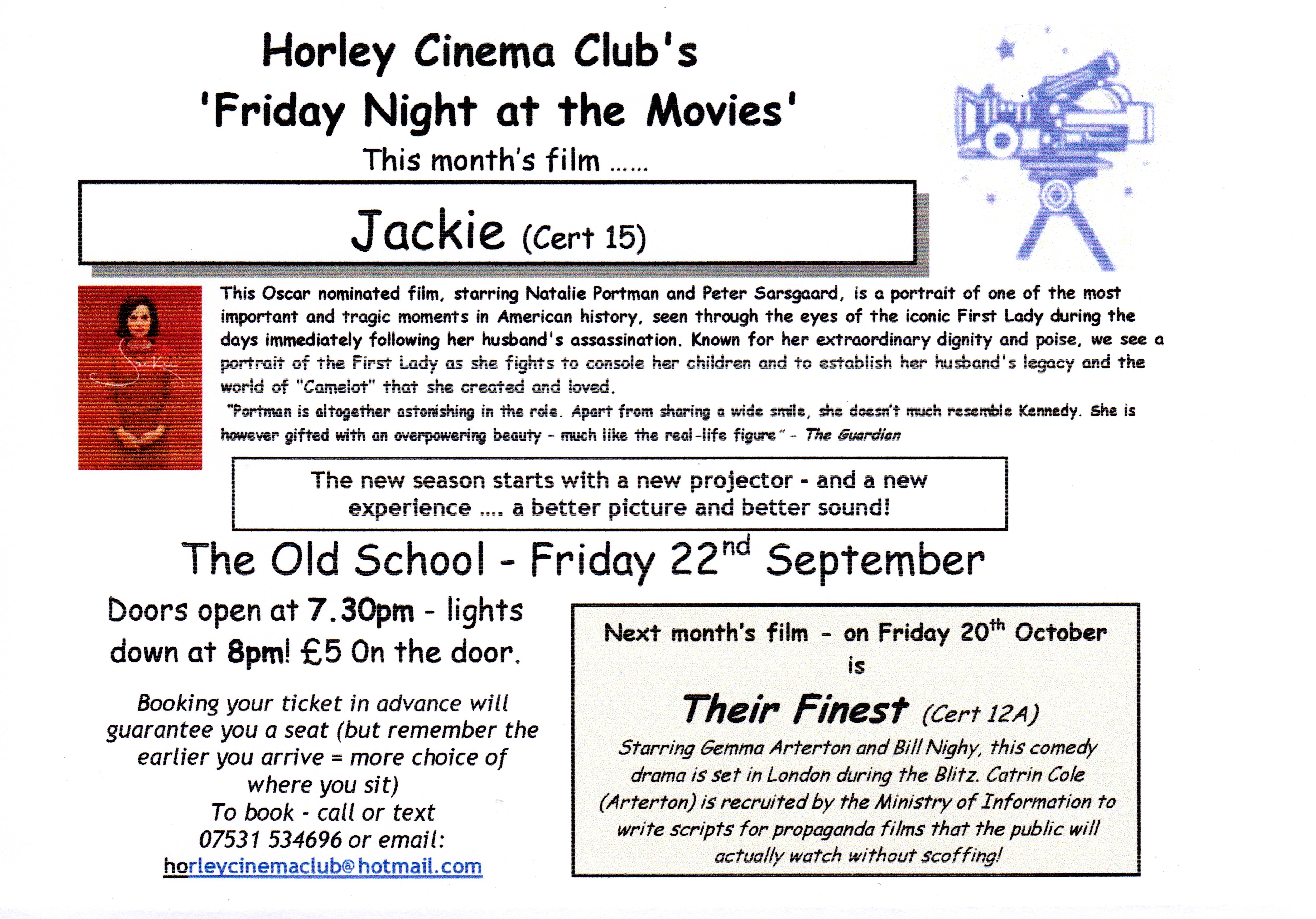 Cinema Club Starts this Friday 22nd September The new season of ‘Friday Night at the Movies’ stars this Friday and is showing ‘Jackie’. With a new projector it promises an even better picture and sound experience. For more details see below. To share : Click to email a link to a friend (Opens in new window) Email Click to share on X (Opens in new window) X Click to share on Facebook (Opens in new window) Facebook Like Loading... Related