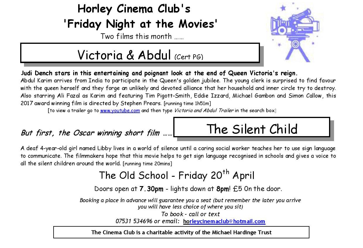 This month’s cinema club film is ‘Victoria and Abdul’. Prior to the showing of this film there will be a screening of the award winning ‘The Silent Child’. This film is only 20 minutes long so the start time will be the usual time i.e. 7.30. The MHJ will be making a donation to the charity associated with this film.