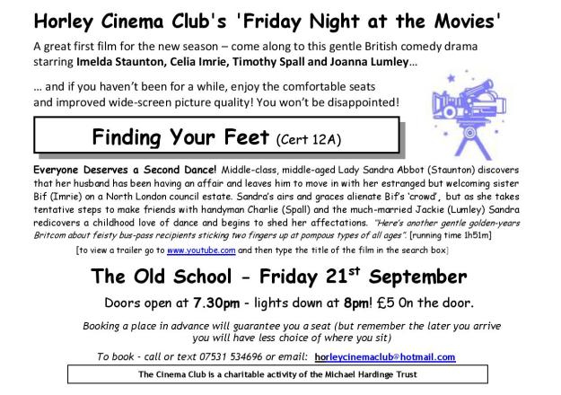 After the Summer break, the new season of the cinema club starts again this Friday, 21st September with a showing of ‘Finding Your Feet’. For a sneaky preview click here.
