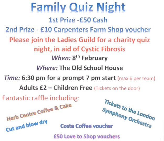 Family Charity Quiz Night Friday Feb 8th Family Quiz Night On Friday Feb 8th at 6.30 in The Old School House Quiz, Raffle and Auction – see below for details AUCTION OF AMAZING PRIZES: 3 Course Meal for 2 at the Falcon Meal for 2 at the Indian Queen Bespoke 2 tier sponge cake To share : Click to email a link to a friend (Opens in new window) Email Click to share on X (Opens in new window) X Click to share on Facebook (Opens in new window) Facebook Like Loading... Related