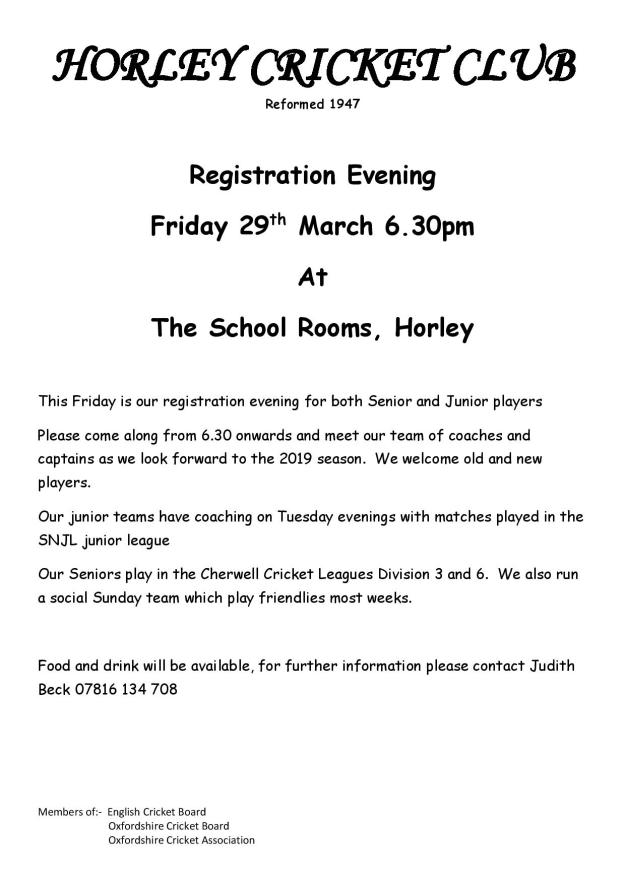 Horley Cricket Club Registration Evening This Friday