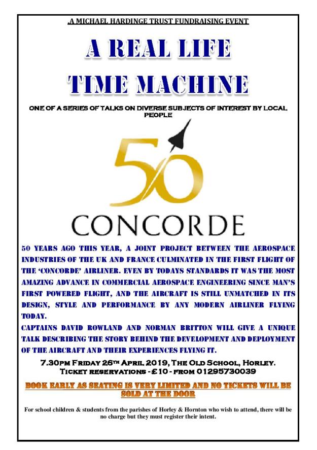 The next MHT talk will be given by ex Concorde Captains David Rowland and Norman Britton at the Old School on Friday April 26th at 7.30. Tickets are selling out fast so book soon if you are interested! See below for details.