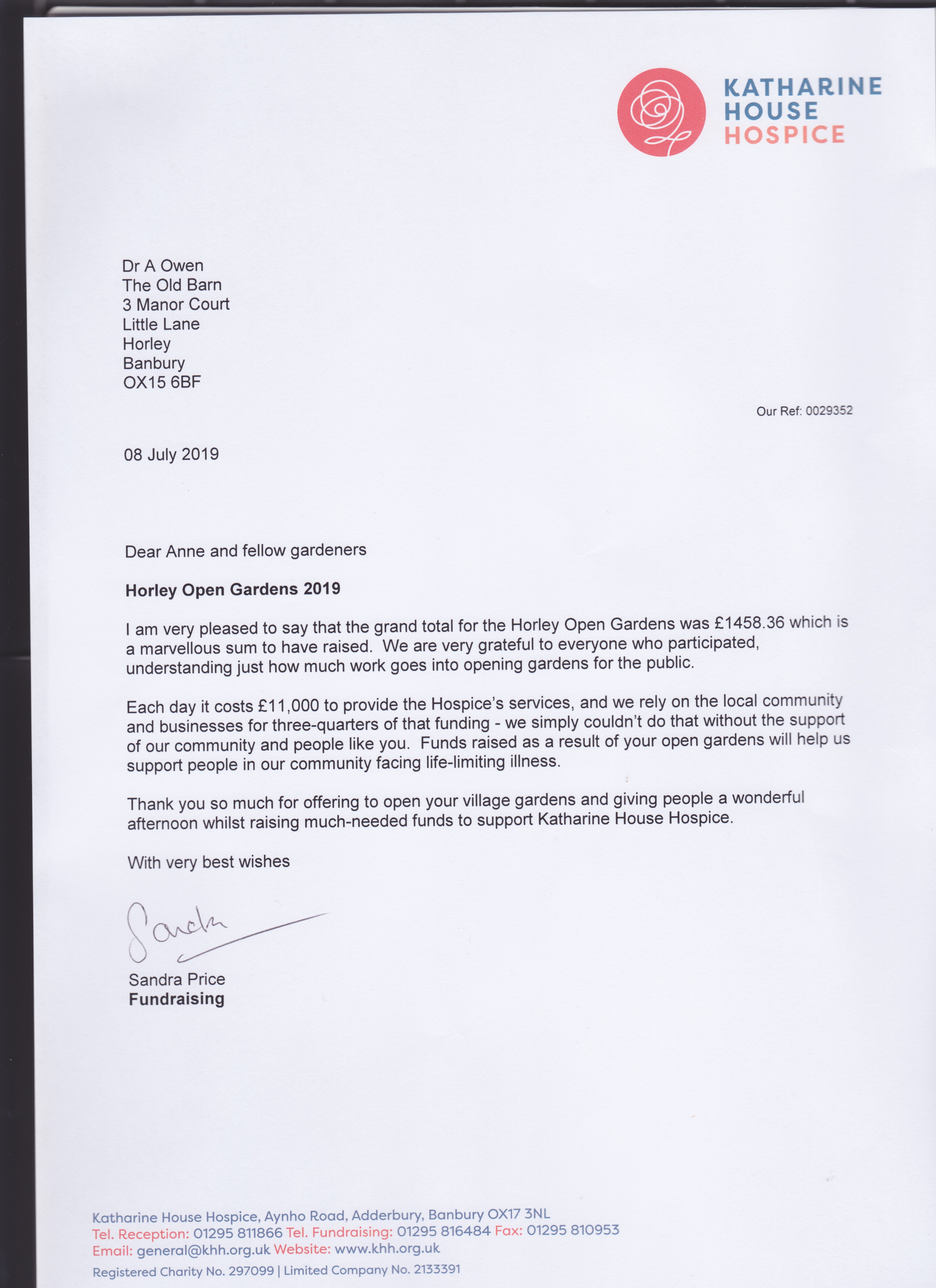 The following is a message from Anne Owen, who was the instigator and organiser of a very successful Open Garden Event in aid of Katherine House Hospice on 30th June.