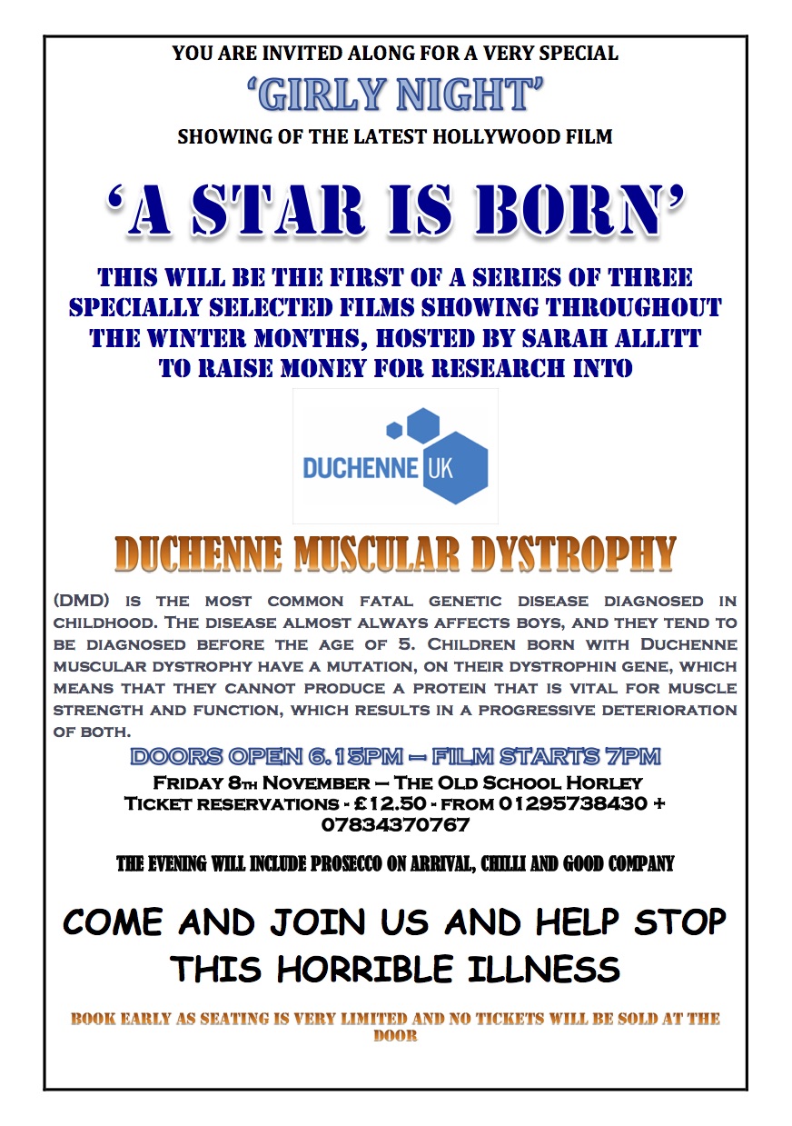 ‘Girly Night’ Film Showing on Friday November 8th There will be a special showing of ‘A Star is Born’ in aid of research into Duchenne Muscular Dystrophy at the Old School House on Friday November 8th. Prosecco on arrival, chilli and a good night’s entertainment all for a good cause! To share : Click to email a link to a friend (Opens in new window) Email Click to share on X (Opens in new window) X Click to share on Facebook (Opens in new window) Facebook Like Loading... Related