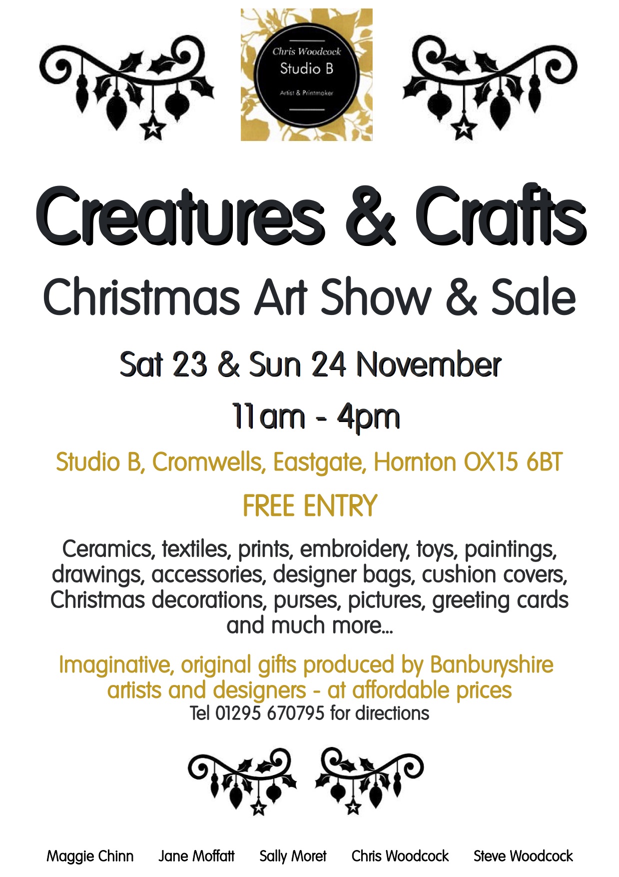 Creatures and Crafts is the title of Studio B’s first art show and sale on the weekend of 23 and 24 November, 11am to 4pm daily. Entry is free and you get to see the work of five local artists, ranging from ceramics and screen printing to drawings, paintings, textile art and handmade Christmas decorations. There will also be bags, scarves, accessories and toys and a range of greetings cards. (See poster below).