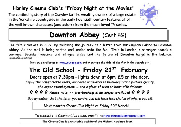Next Cinema Club Showing Friday February 21st The season of blockbuster films continues with a much requested “Downton Abbey” See here for a taster. To share : Click to email a link to a friend (Opens in new window) Email Click to share on X (Opens in new window) X Click to share on Facebook (Opens in new window) Facebook Like Loading... Related