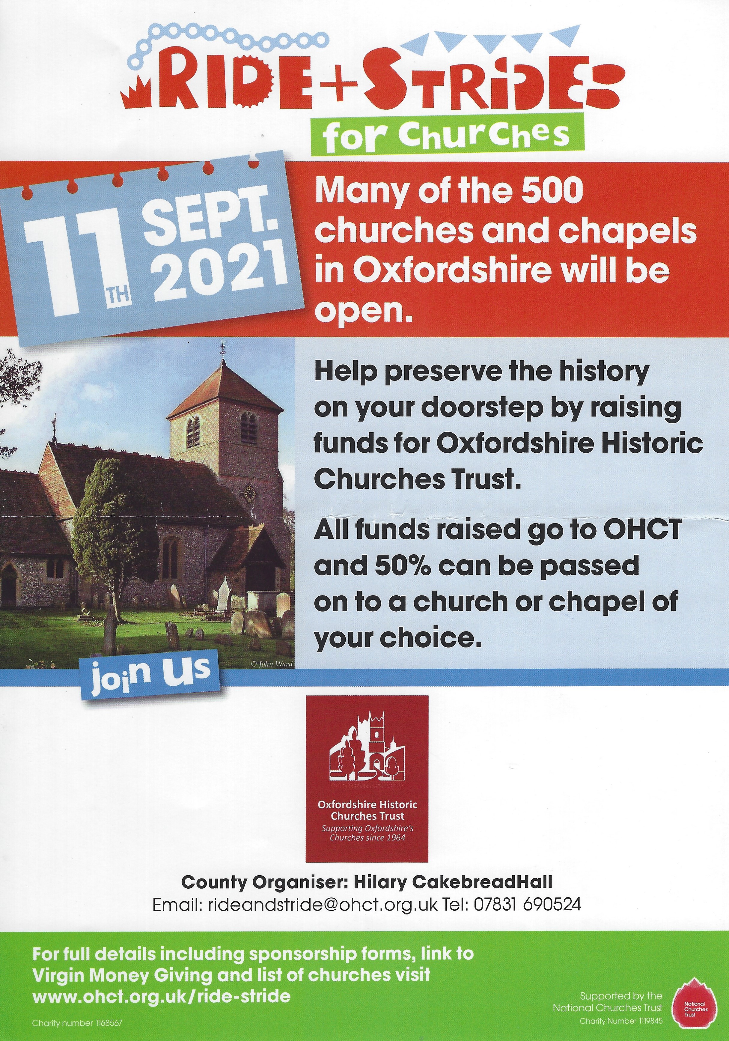 Ride and Stride for Oxfordshire Historic Churches is taking place on Saturday 11th September. See poster below or visit www.ohct.org.uk/ride-stride for details of how to take part.