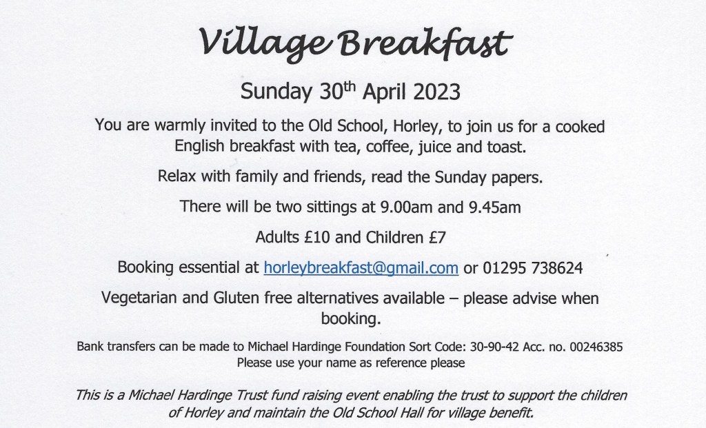 Please join us at the Old School for the Village Breakfast. There are two sittings each with a maximum capacity of fifty people. Please book early to avoid disappointment via horleybreakfast@gmail.com or 01295 738624. Booking deadline is Friday 28th April.