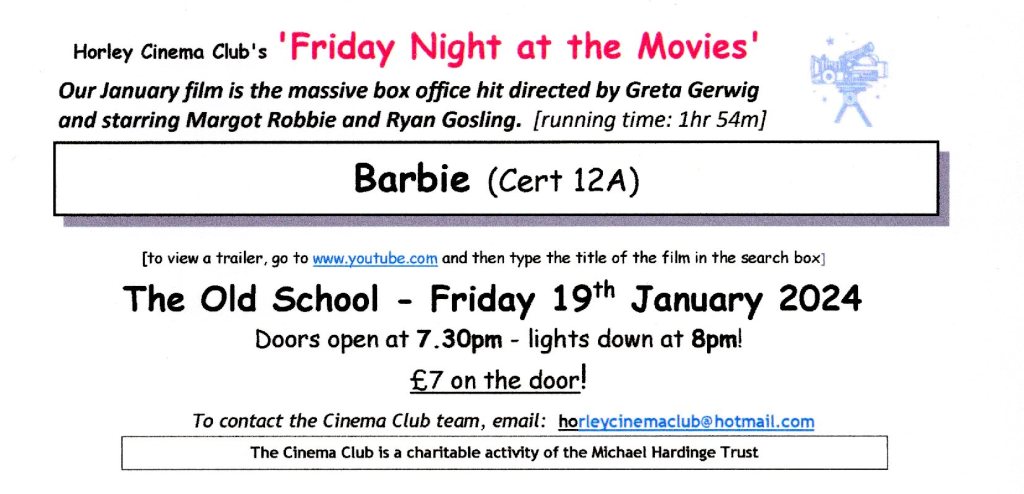 Cinema Club on Friday 19th January will be showing… Barbie! Don’t miss the chance to see Barbie next Friday at the Old School, Horley: To share : Click to email a link to a friend (Opens in new window) Email Click to share on X (Opens in new window) X Click to share on Facebook (Opens in new window) Facebook Like Loading... Related