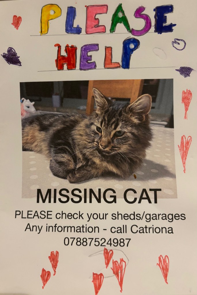 Missing cat The Harries’ cat Crumble hasn’t been seen for 48 hours – have you seen him? Please check your sheds to make sure he’s not shut in. To share : Click to email a link to a friend (Opens in new window) Email Click to share on X (Opens in new window) X Click to share on Facebook (Opens in new window) Facebook Like Loading... Related