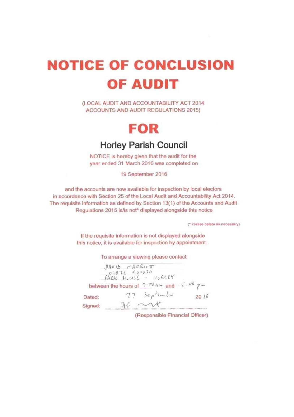 The annual audit of Horley Parish Council has been completed and is available to view here