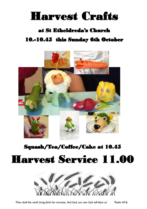 Rev’d Guy Edwards say ‘Celebrate the goodness that God shows to us in the fruits and flowers and grain of autumn, and all that comes to maturity at Harvest time. This Sunday at St Etheldreda’s – a traditional Harvest Festival service, with all your favourite harvest hymns. Children welcome.’