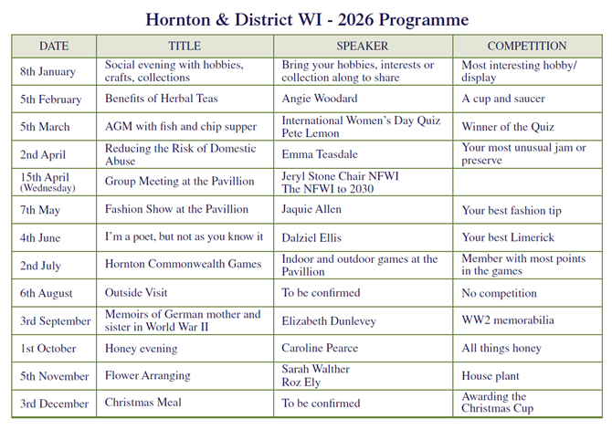 Emma Hamer, President, Hornton & District W.I. emma.hamer@nfu.org.uk 074689 084691