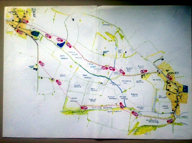 I came across the original maps for the Horley circular walk that Mike Patching, Margaret Condon and I worked from with Kevin Larner (CDC), more to follow… Debra