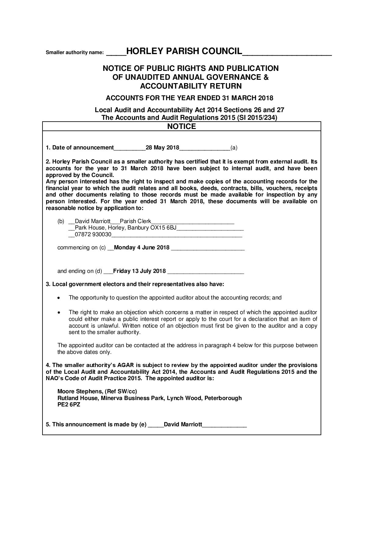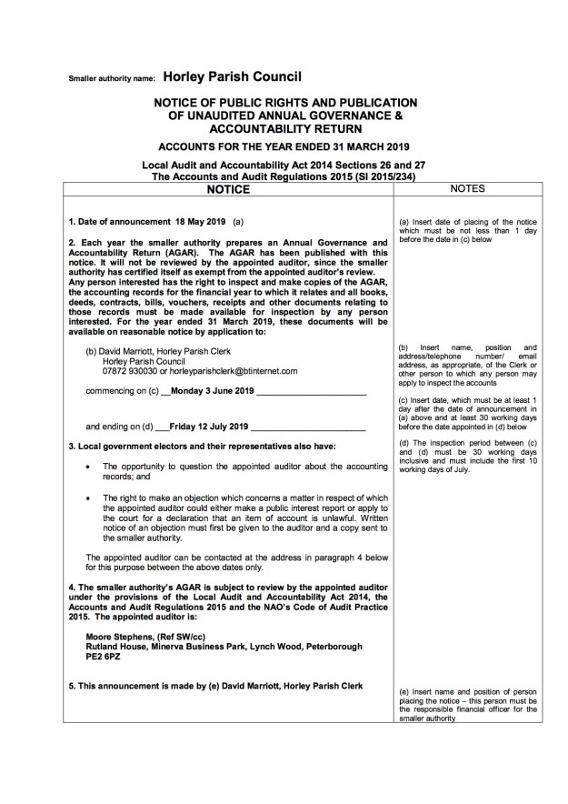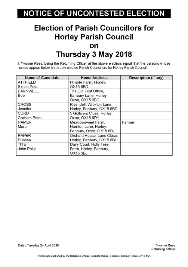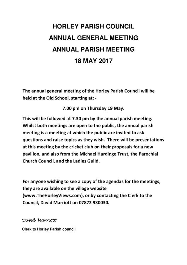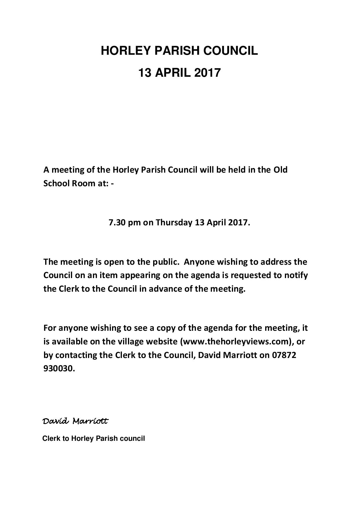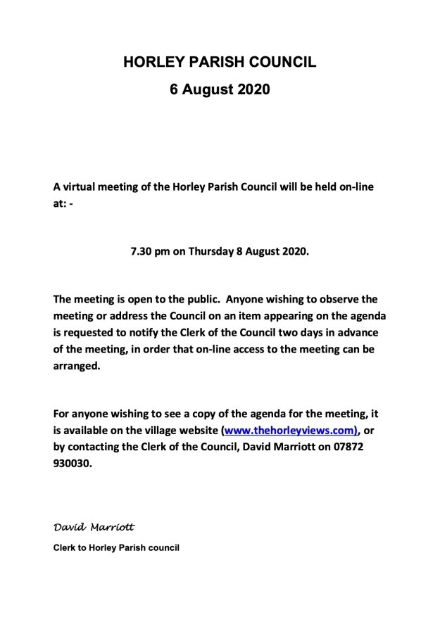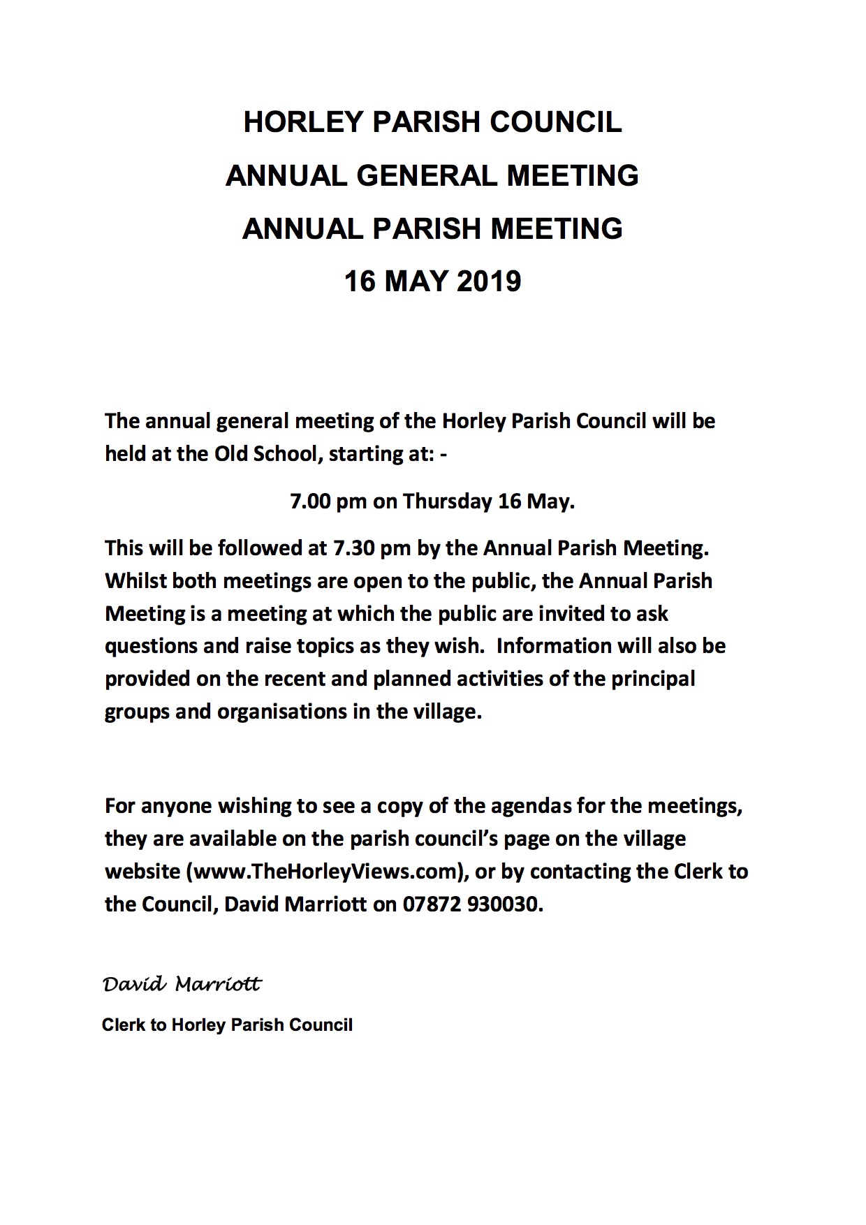 If you are interested in becoming a Parish Councillor or would like to find out more, please contact the clerk, David Marriott, on 730726 or horleyparishclerk@btinternet.com or the Chairman, Simon Atfield on 738898.