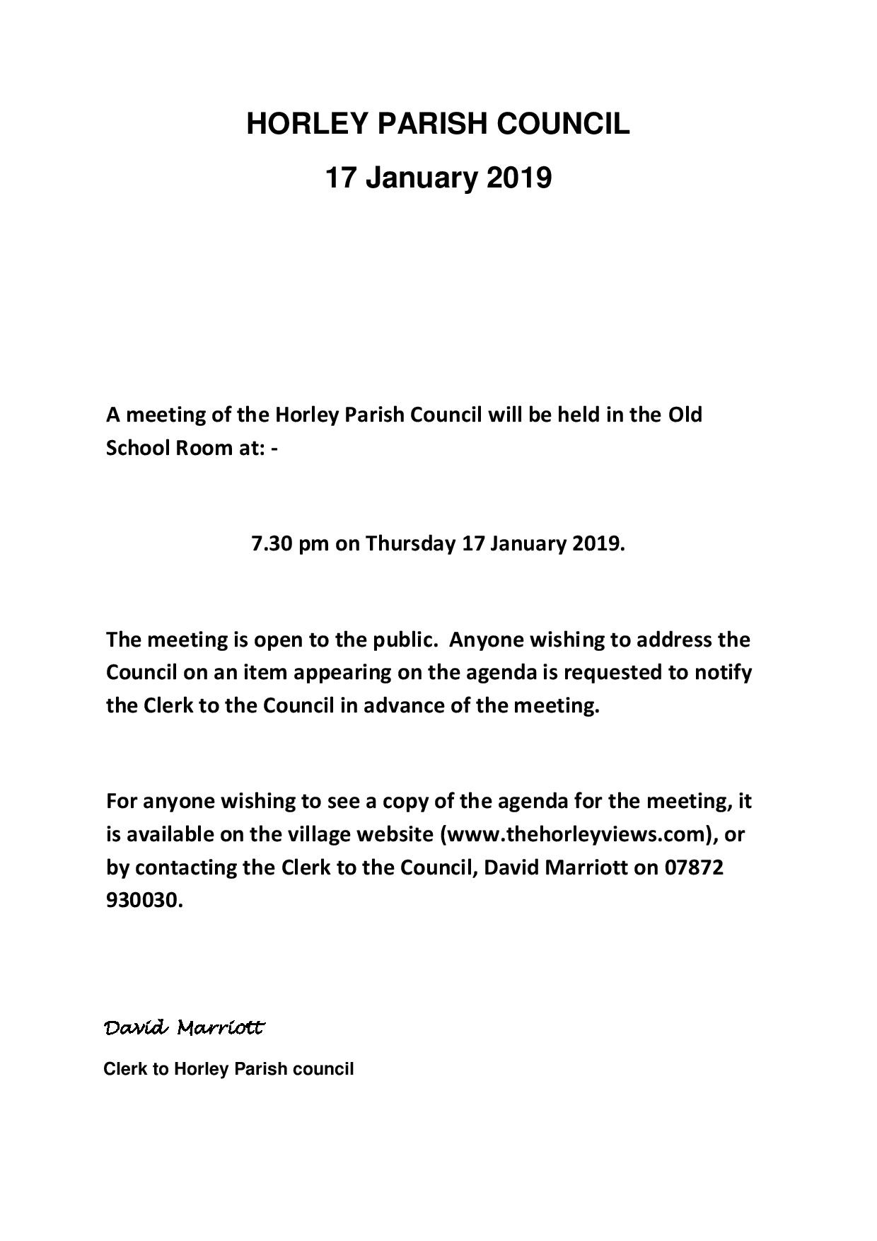 For anyone wishing to see a copy of the agenda for the meeting, see 16 01 07 agenda or contact the Clerk to the Council, David Marriott on 07872 930030.