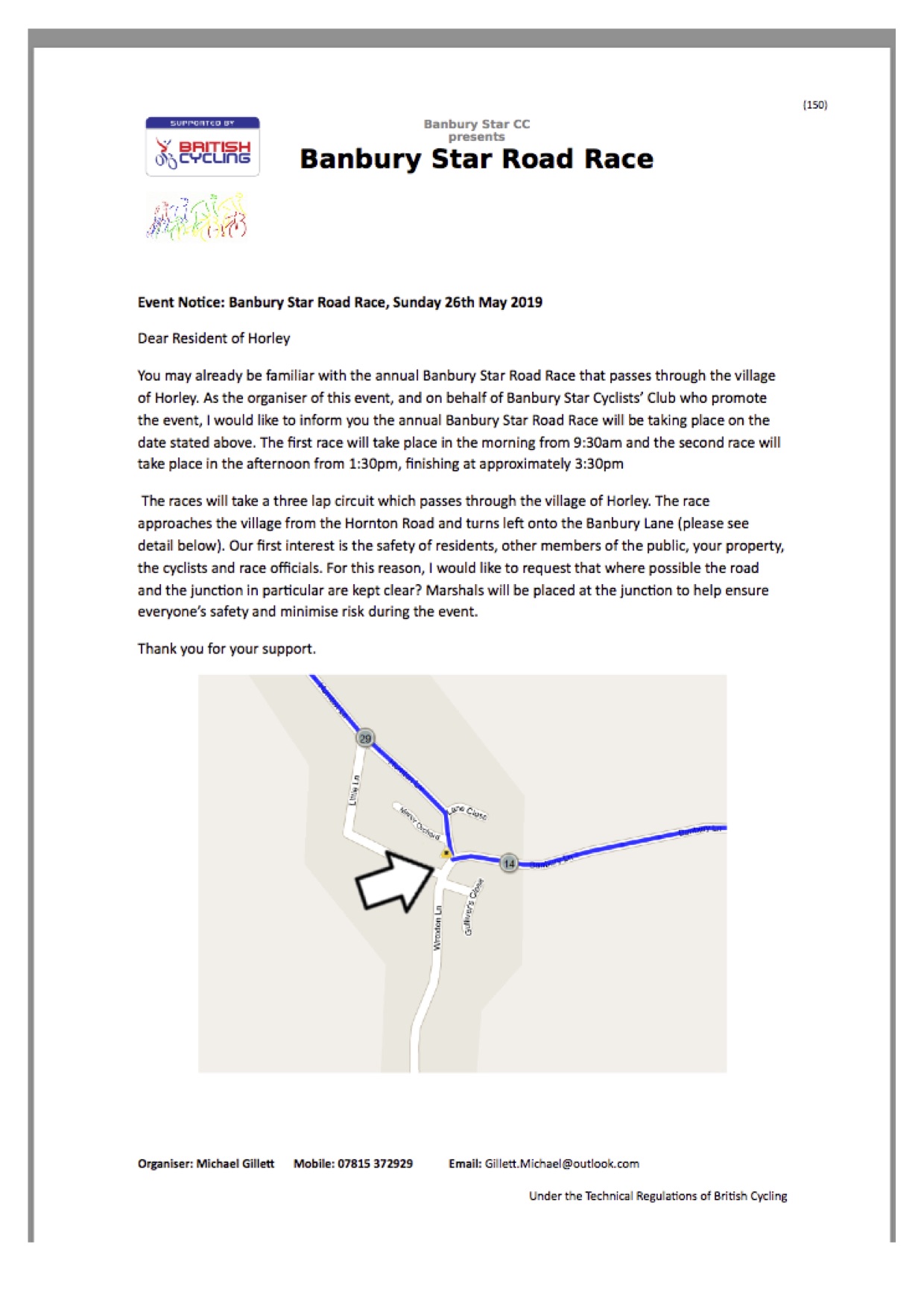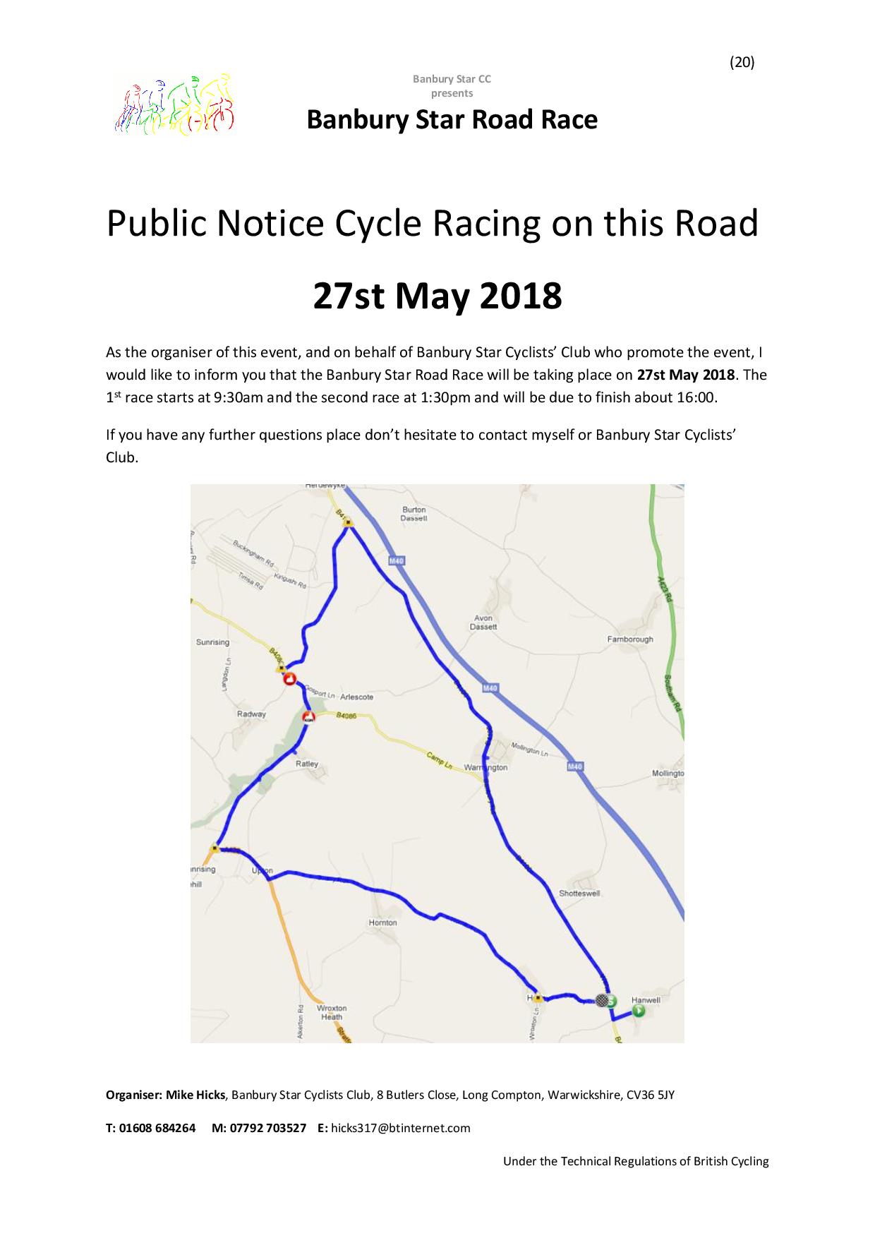 Look out for cyclists racing through the village tomorrow (19th May) in the Banbury Star Road Race.