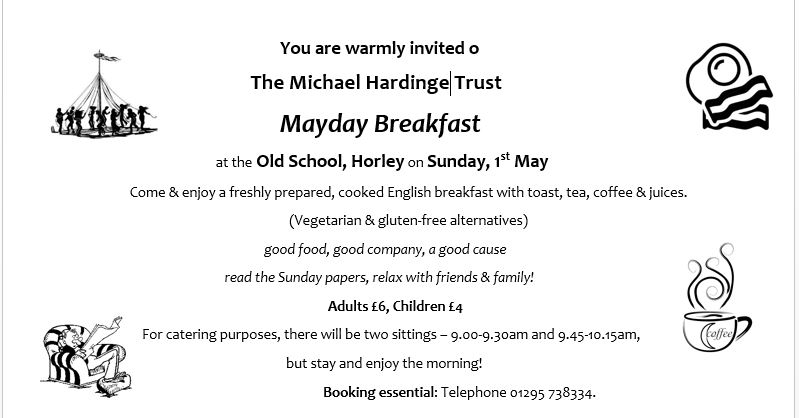You are warmly invited to The Michael Hardinge Trust Mayday Breakfast at the Old School, Horley on Sunday, 1st May Come & enjoy a freshly prepared, cooked English breakfast with toast, tea, co…