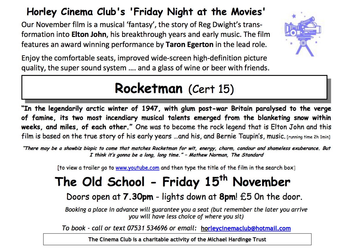 By popular demand the Cinema Club is continuing the musical theme with our next film “Rocketman”. Please come along and enjoy the early years of Elton John. See here for a taster.