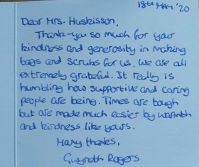 Thanks have also been received from Katherine House Hospice saying how grateful they are for the scrubs sent last week.