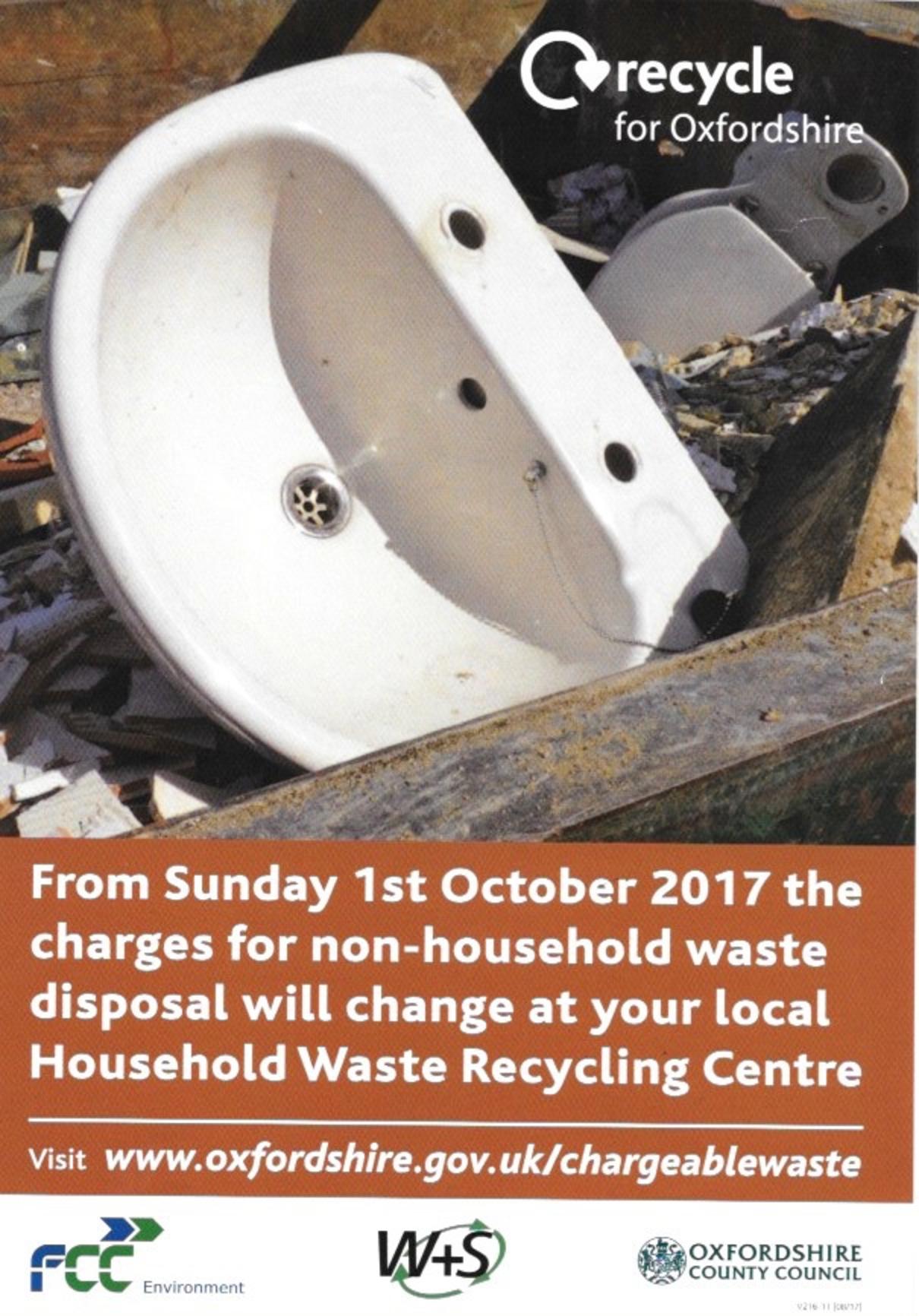 From 1 October Oxfordshire County Council are planning to introduce charges for the disposal of certain items at their waste and recycling centres such as Alkerton. The charges do not apply to normal household waste or garden waste, but apply to the sort of waste generated by DIY projects similar to builder’s waste.